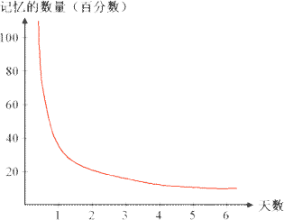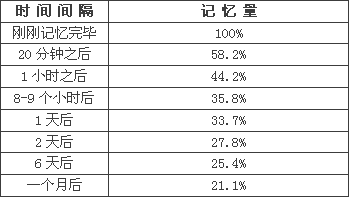 这条曲线告诉人们在学习中的遗忘是有规律的,遗忘的进程不是均衡的,不是固定的一天丢掉几个,转天又丢几个的,而是在记忆的最初阶段遗忘的速度很快,后来就逐渐减慢了,到了相当长的时候后,几乎就不再遗忘了,这就是遗忘的发展规律,即"先快后慢"的原则。观察这条遗忘曲线,你会发现,学得的知识在一天后,如不抓紧复习,就只剩下原来的25%)。随着时间的推移,遗忘的速度减慢,遗忘的数量也就减少。有人做过一个实验,两组学生学习一段课文,甲组在学习后不久进行一次复习,乙组不予复习,一天后甲组保持98%,乙组保持56%;一周后甲组保持83%,乙组保持33%。乙组的遗忘平均值比甲组高。