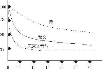 从下面这个图中,我们可以看到,人们对无意义的音节的遗忘速度快于对散文的遗忘,而对散文的遗忘速度又快于有韵律诗。