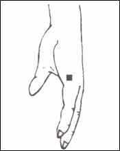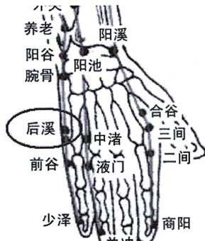 注:后溪穴在手侧面小拇指下两三厘米处,见上、下附图