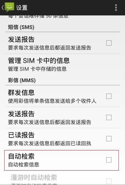 2. 在打开短信,在...的菜单设置里,关闭 MMS 的自动检索信息