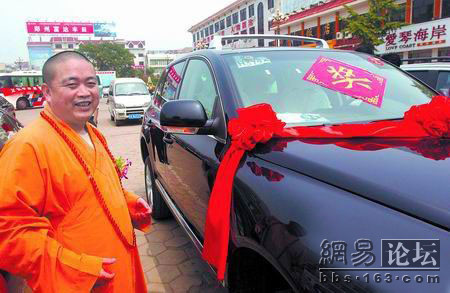 少林寺方丈释永信说:“明年要拿更大的奖”。价值100多万的德国大众途锐:内饰豪华、讲究,真皮、桃木,方向盘可加热,无钥匙进入功能,四区域空调,后座上4个可独立精确调节的空调风口,分区空调可以营造车内的四季。导航系统,指南针、海拔仪和卫星定位等,越野时还能显示转向角。电视接收器……车顶上有7个照明灯,电动伸缩的挂车连接器
