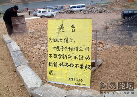 8、我和知客师交谈:“这里没有电视可以理解,怎么没有电脑啊?如果做个网站,在网上介绍大悲寺多好,而且可以在网上说法、、、”。师:“呵呵,电脑是好东西吗?好人迷恋电脑之后如何啊?呵呵,来这里出家的,让他们上网,是害他们啊!和尚迷恋了电脑就会退了道心、没有了出发心、、、你信吗?”