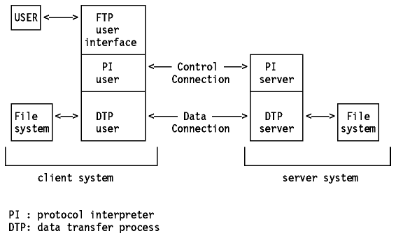 在FTP应用的两端都有一个协议解释器(PI)和一个数据传送进程(DTP)。在连接的客户端还有一个用户界面。