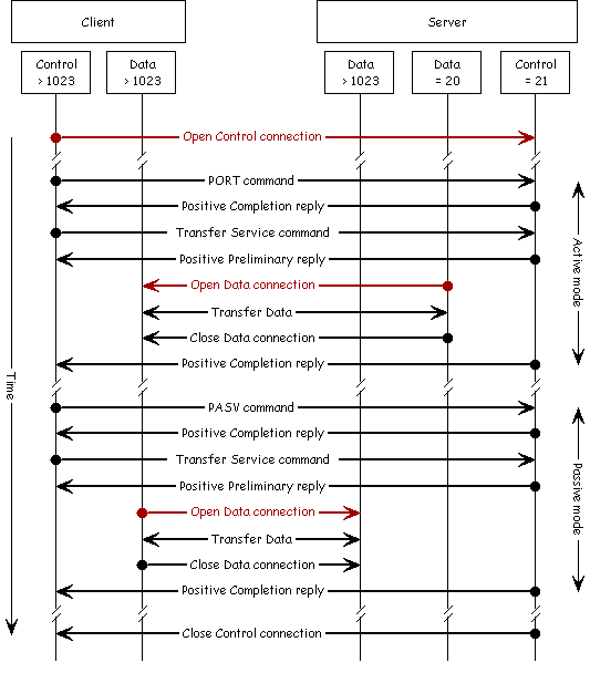 FTP协议是一个显得稍微有点凌乱的协议,并且没有任何为(应用于)防火墙(环境中)的(特别)设计。FTP客户端可以使用两种模式中的一种:端口模式和被动模式。端口模式已经存在很长时间了,但是被动模式更加流行,因为其不需要FTP服务器主动向内访问从而和FTP客户端建立(第二)连接。现在的防火墙和NAT设备可以在(第一连接中,即控制连接中的)PORT和PASV命令中得到FTP连接的详细信息来支持客户端的FTP请求(和会话),从而增强了FTP协议的安全性。