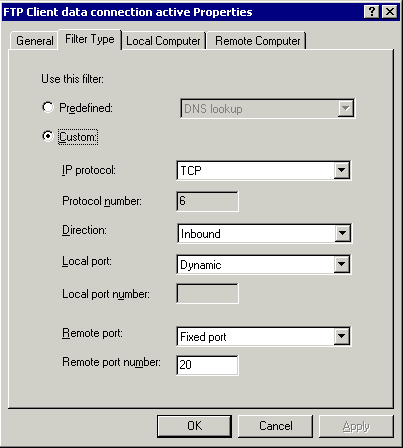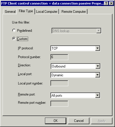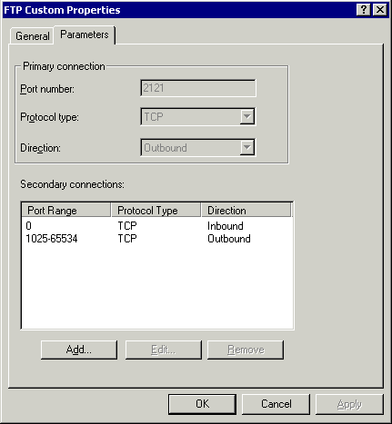 要允许一个防火墙客户端用户向外访问FTP服务器,你必须允许这个用户可以使用预定义的FTP协议(规则),并且确保FTP应用层过滤器是启用的。你可能想知道为什么后一点也是必须的,因为这看起来和我前面提到关于防火墙客户端是如何工作的有些矛盾。再次(说明),如果你仔细查看预定义的FTP协议(规则),你就可以看到(在这个规则中)只有第一连接(FTP控制连接)是被定义的,而没有(定义)第二连接。所以,如果FTP应用层过滤器没有被启用,就不可能建立FTP数据连接。除非你启用并允许了一条“'All IP traffic”的规则。