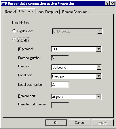 如果你查看那些预定义的协议,你可以找到为FTP客户端和服务器定义的FTP协议。这两个(预定义的)协议都是应用层过滤器。这就是 说ISA完全支持FTP客户端的向外访问和(内部的)FTP服务器的发布。要配置ISA支持FTP客户端(对外的)访问和FTP服务器的发布,你首先要检查FTP应用层过滤是启用的(这应该是缺省值)。对于客户端访问,也必须有一条允许客户端使用FTP协议的规则。对于FTP服务器发布,要确保在服务器发布规则中FTP服务器规则被选择(启用)。