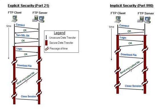 可以认为隐式安全总是“始终打开”的,而显式安全是要被“打开”(才能使用)的。下面是GlobalScape 公司(著名的CuteFTP FTP客户端软件)站点上的一个很好图示,说明了显式和隐式安全SSL连接的区别: